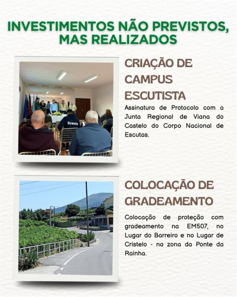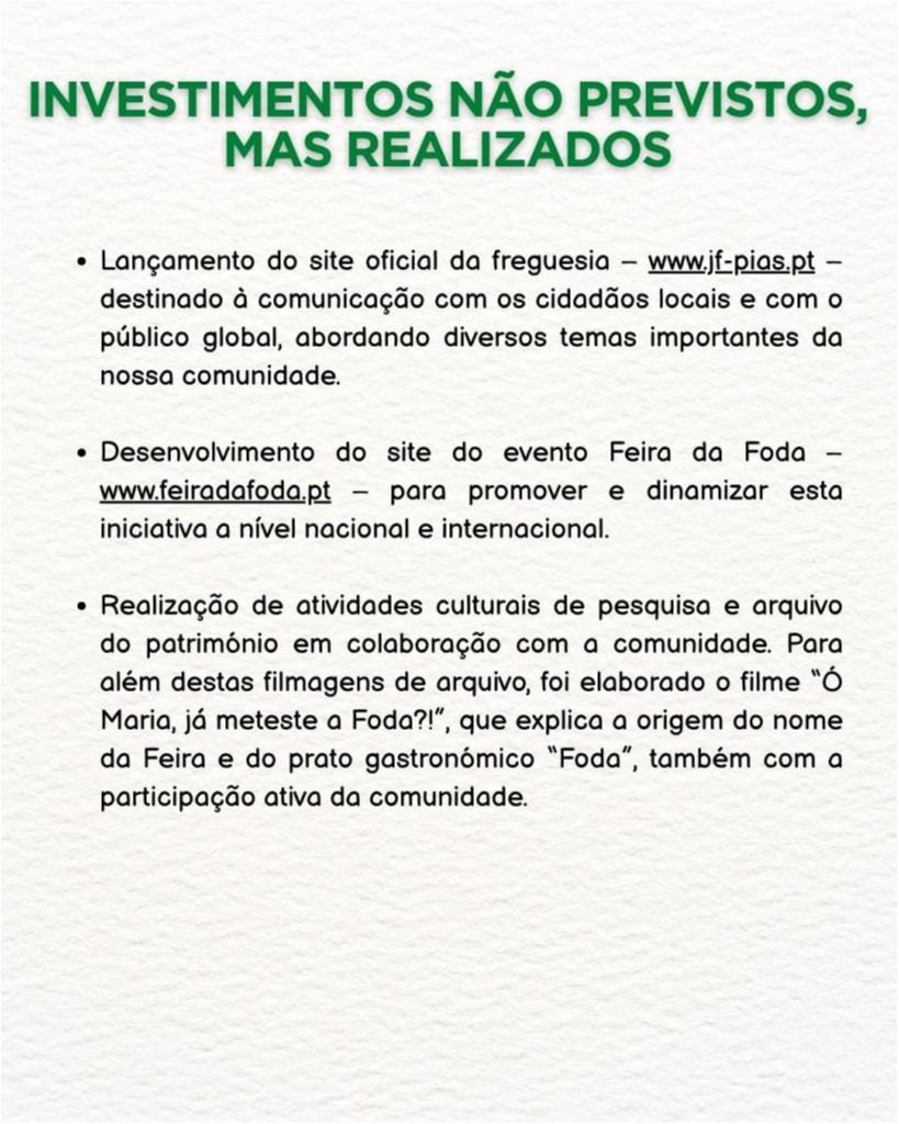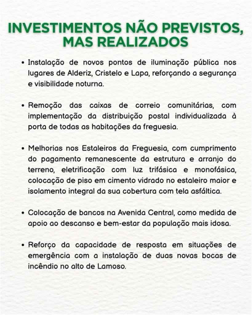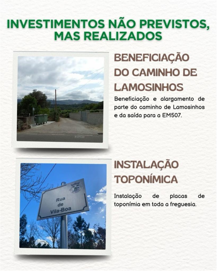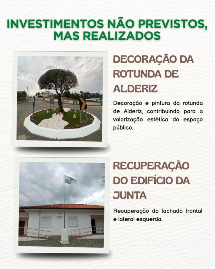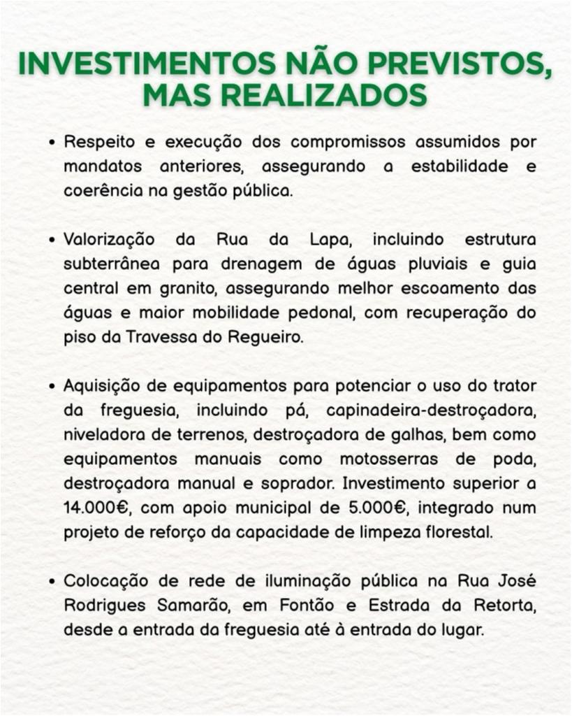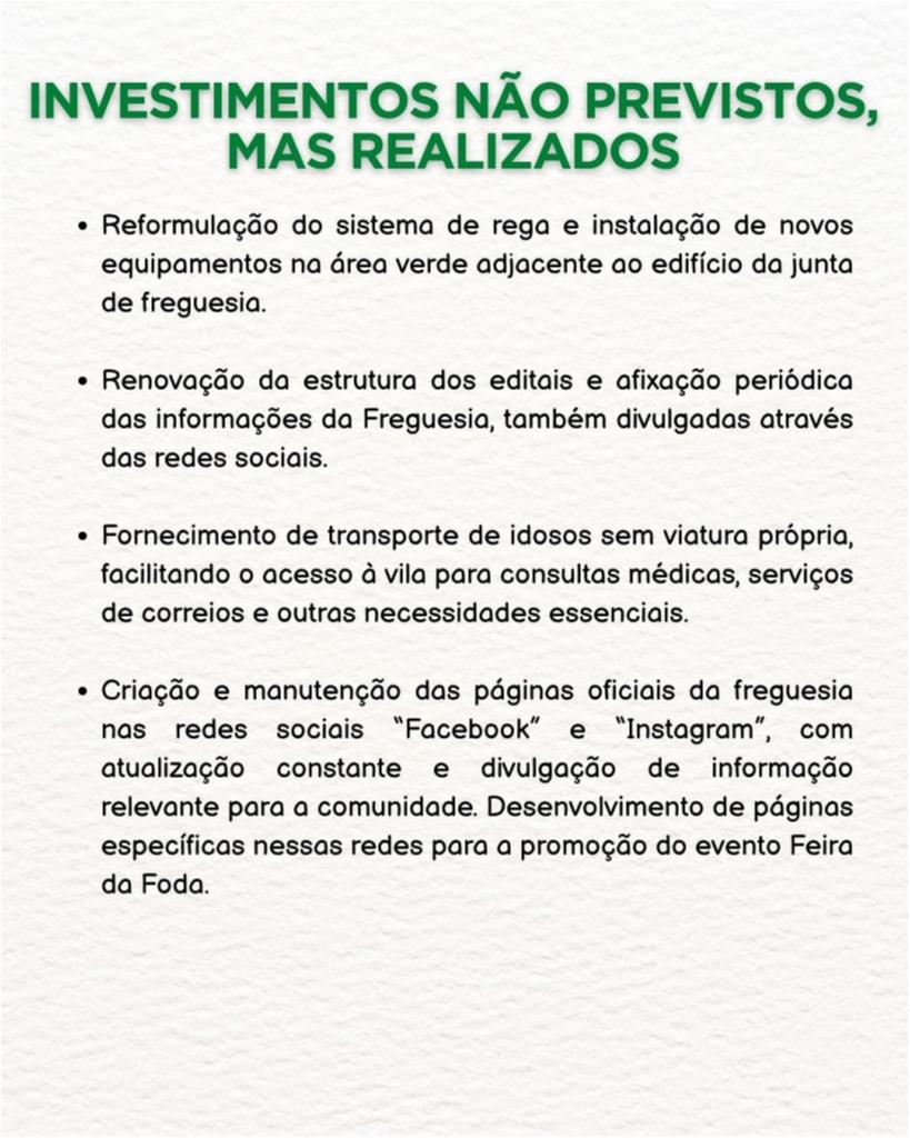 Nesta publicação apresentamos os investimentos não previstos inicialmente, mas que foram assumidos e concretizados pela Junta de Freguesia, em resposta às necessidades da população ![]()